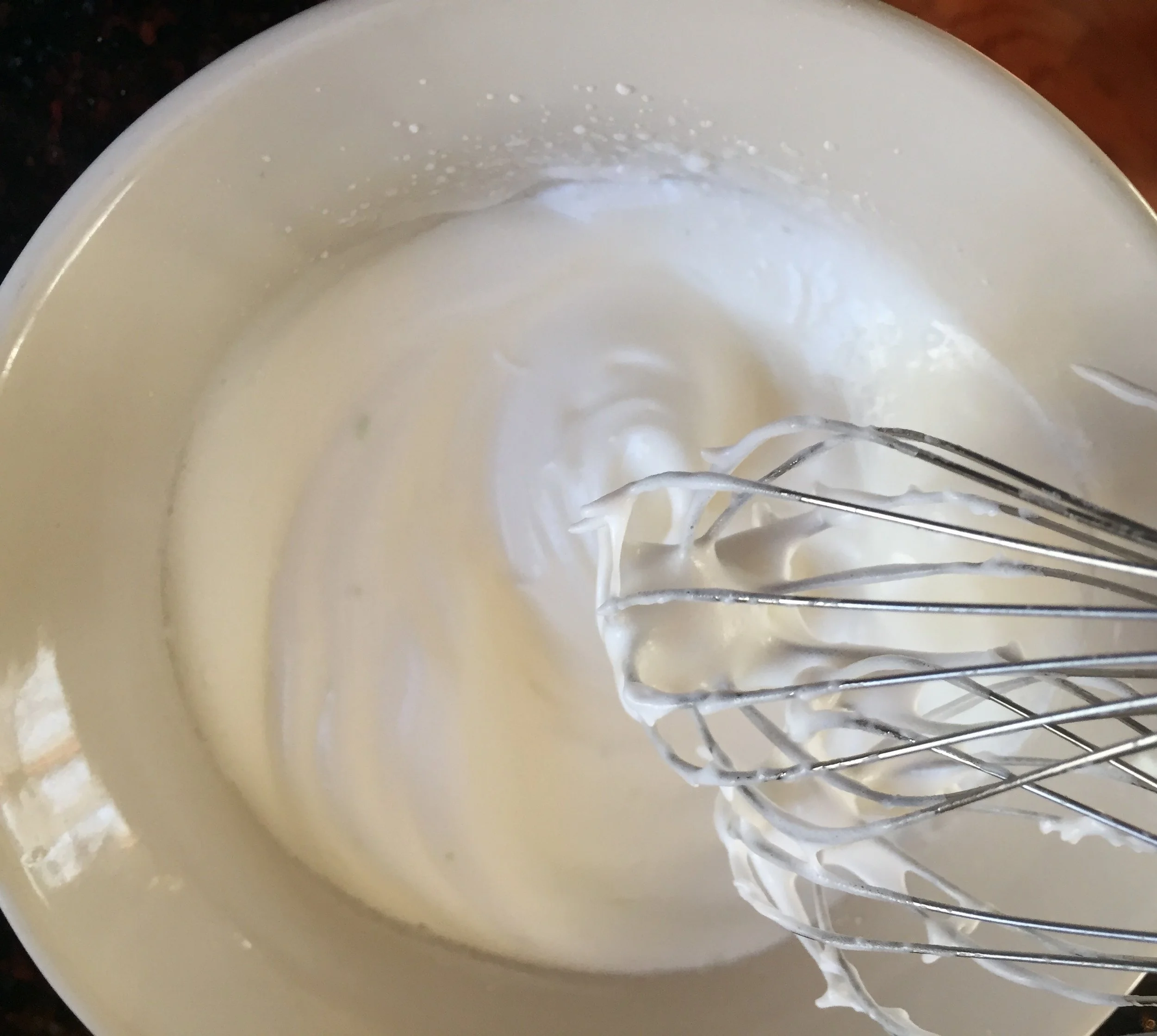 Now it's time to combine bowls to form the fluffy filling. You will be adding the whites to the yolk/ lime bowl one third at a time and folding them together GENTLY! This means not traditional mixing but a horizontal, circular motion. Using a wire whisk, you will be adding the delicate whites to the yolks and maintain a fluffy consistency. I refer the motion to forming circles with your wrist and moving the whisk from bottom of bowl to top of mixture. The mixture will flow through the whisk and carefully incorporate the yolk mixture with the whites. Continue the folding process until all whites are added and you have a creamy final product as shown above.