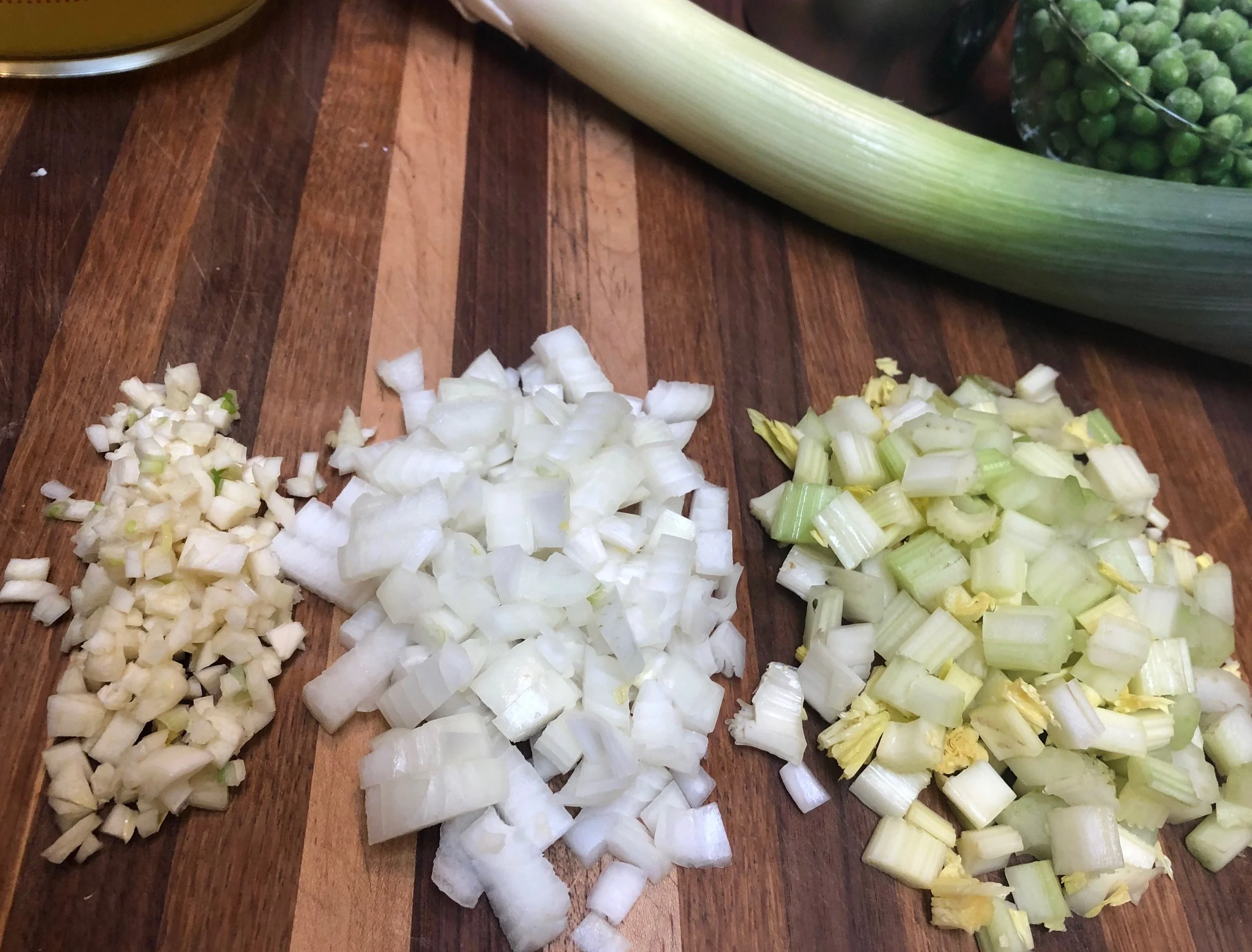 Every soup starts with aromatic veggies... at least mine do! Chop the onions and celery, mince the garlic. Place a 5 – 6 quart soup kettle over medium high heat with olive oil and butter, for about 2 – 3 minutes. Add onions, celery and garlic and sauté until translucent, ~ 3 – 4 minutes.